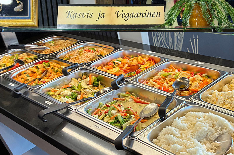 Faasai Kalevan thaimaalainen buffet sisältää reilun salaattipöydän, maistuvan keiton, sekä ennen kaikkea herkullisen ja runsaan Thai-buffet-pöydän, josta löytyy maukkaiden lihojen lisäksi myös maittavia kasvisvaihtoehtoja sekä sushia. Lapsille sopivia ruokia löytyy myös buffetista. Jälkiruoaksi voi nauttia leivonnaisia ja jäätelöä kahvin tai teen kanssa.